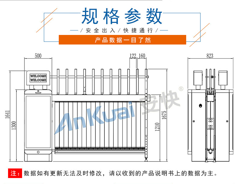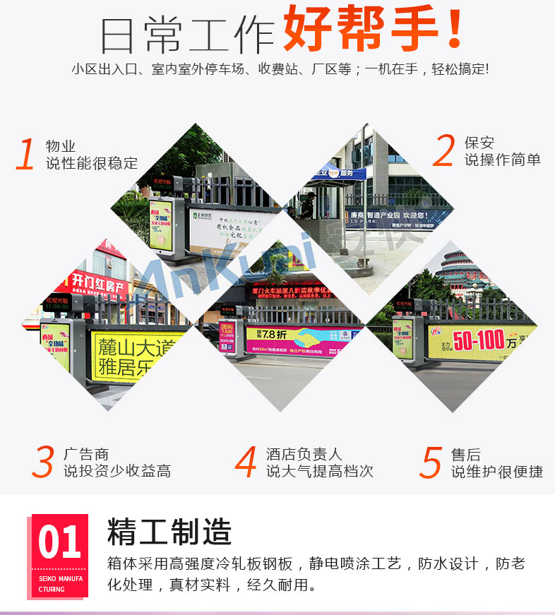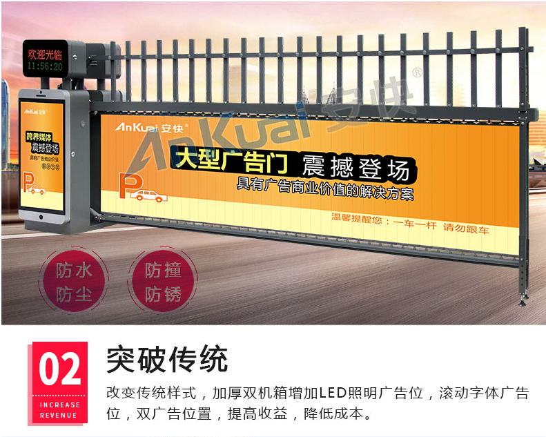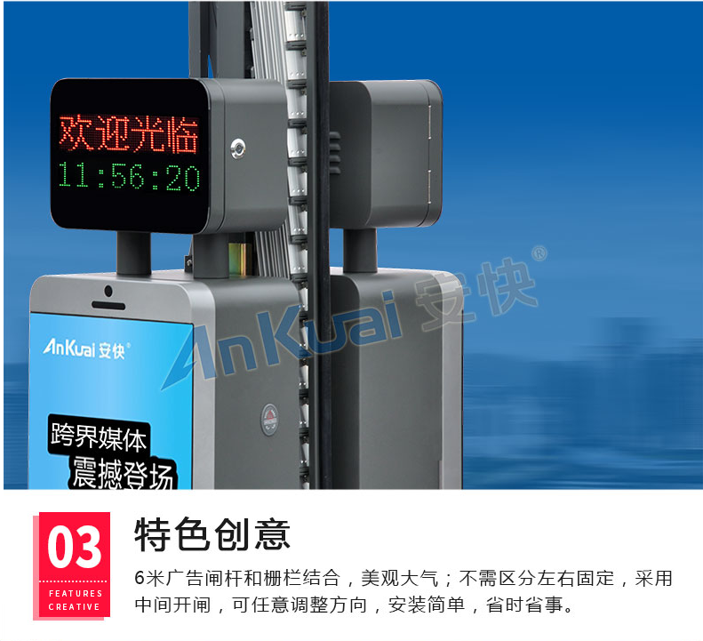 1、機箱大氣穩(wěn)重,采用中間開閘,不需區(qū)分左右固定;2、全新結構,運行平穩(wěn),性能可靠,維護方便;3、采用壓力防砸和紅外防砸雙重保護,保障安全出入;4、閘桿采用廣告道閘和柵欄結合,更加美觀大氣,運用更加廣泛;5、起落過程中,葉片翻轉柵欄收放,具有科技美感!